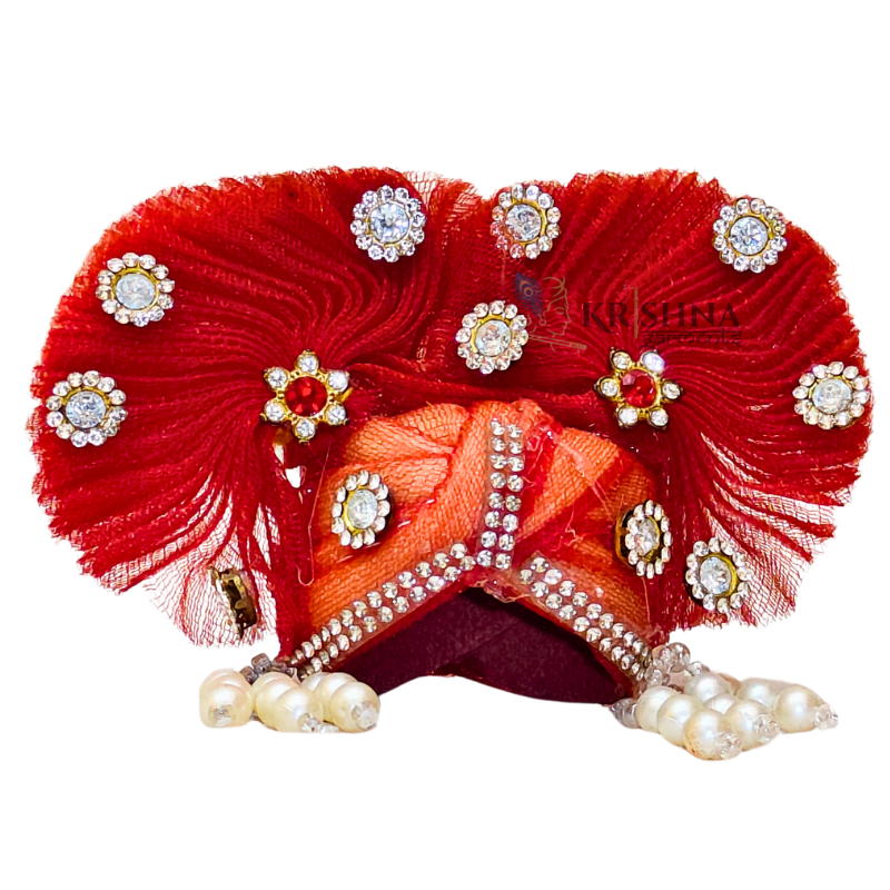 This stone-studded red mukut is a perfect gift for Krishna devotees and an essential part of Laddu Gopal’s shringar collection.